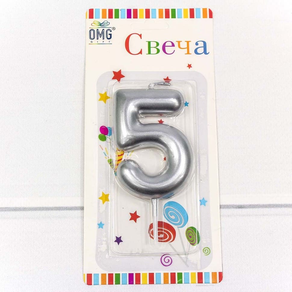 —Свеча для торта 'Цифра 5. Серебряный', OMG, 6 см, картон. уп., европодвес, ОМ-20014;5