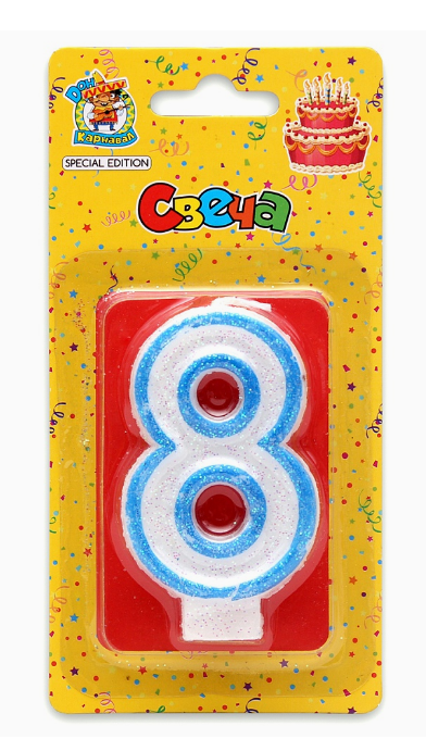 Свеча для торта, цифра 8, с синей окантовкой и блёстками, С-1106
