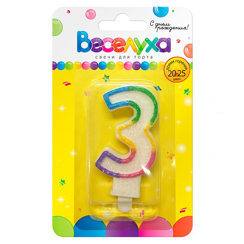 —Свеча для торта 'Цифра 3. 'Разноцветный градиент'' с глиттером.,картон. уп., европодвес, 620086-3