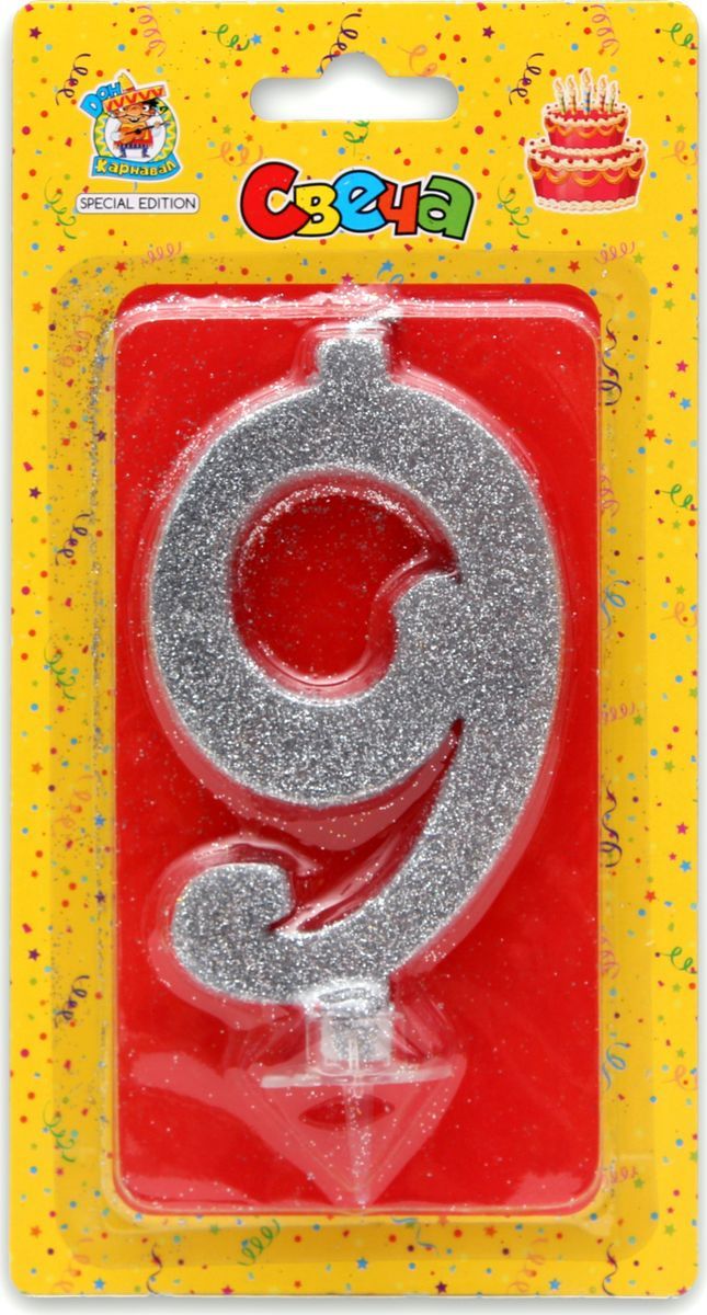 —Свеча для торта 'Цифра 9. Серебряный глитер' Миленд, картон. уп., европодвес, С-1891